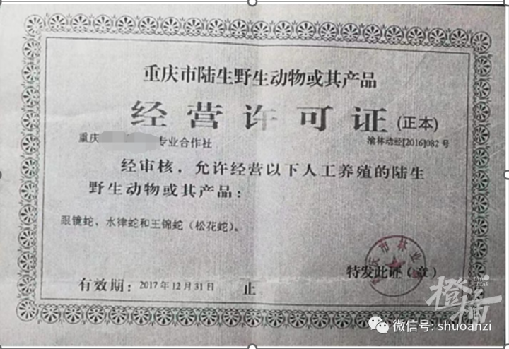但据葛称,他的蛇是有证的,是养殖的,其上家供货单位有允许经营人工养殖的陆生野生动物或其产品经营许可证。该经营许可证上注明:眼镜蛇、水律蛇和王锦蛇。