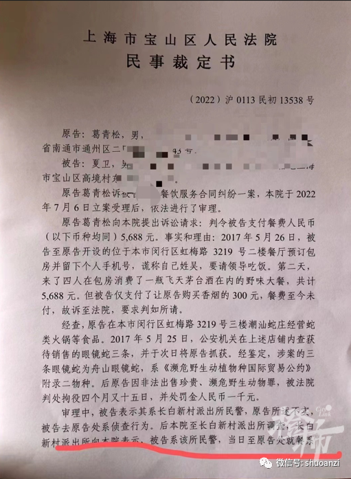 但诡异的是,裁定书上,原告指出:5月26日,被告当时到饭店自称姓吴,说邀请领导来餐厅吃饭来订餐,次日来了四人,吃了野味喝了一瓶飞天茅台,共计5688元,但仅支付了300元,餐费至今未付。5年后,原告起诉到法院,要求被告支付餐费。