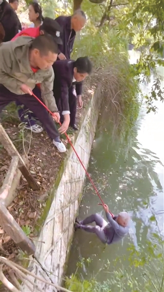 这时岸边已经有很多工具,笤帚、绳子、梯子……都是小区邻居拿来的,但都有点短,没办法把人拉上来。