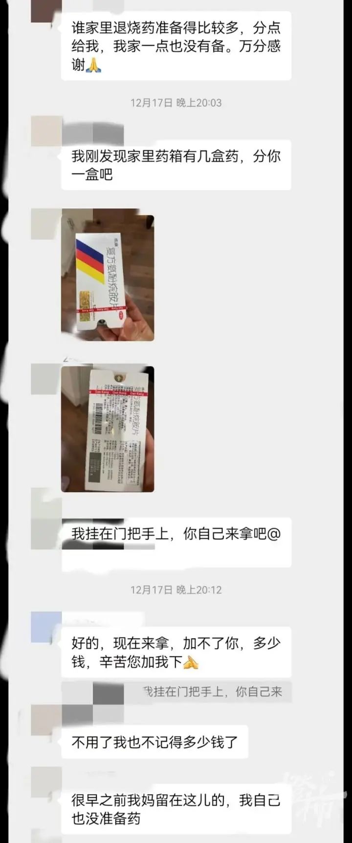 12月18日,有邻居在群里问:有没有邻居有退烧药?孩子状态有点不稳定,邮寄来的药3天了还没见踪影,怕傍晚会烧起来。