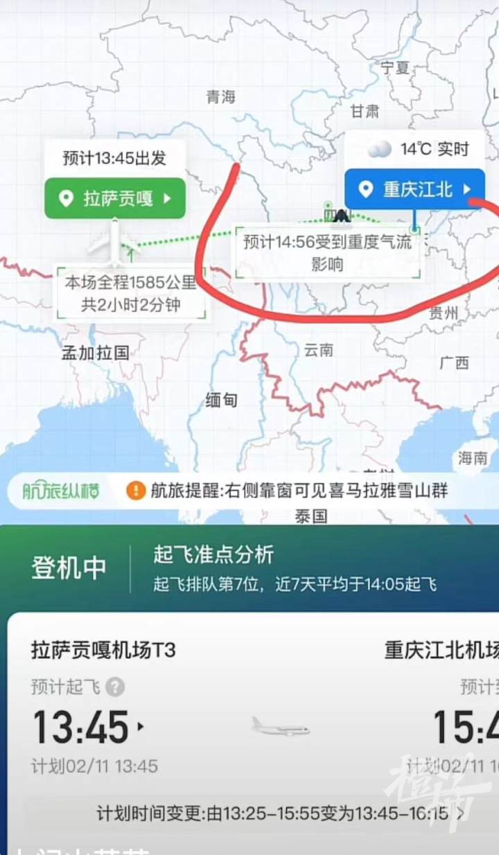据越牛新闻,顾女士是位旅行爱好者,今年大年初一,她和朋友出发飞去了拉萨。当天,她坐早上8点50分的飞机中转重庆,如果顺利的话,航班在下午3点半左右到达拉萨。