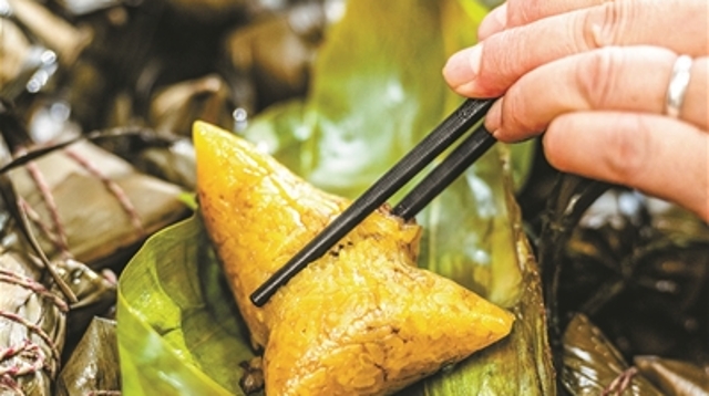 用黄荆柴的草木灰水浸泡过的糯米做出来的粽子,煮熟后就像上过一层金黄色的釉彩,因此,黄荆粽又被称为“黄金粽”,象征着黄金万两、吉祥如意。黄荆柴的药效还让黄荆粽有了一项普通粽子不具备的“超能力”——食用后胃里不胀气、不反酸,对胃很友好,无论老幼,连吃3个100克重的粽子都不用担心消化不了。全是糯米的实心粽初入口时可能略显味道寡淡,不过,糯米香和药草的清香很快会给味蕾第二个层次的回应,激起人们再吃一口的欲望。如果偏爱甜味,可以蘸着糖吃,或选择包着去核桂圆、甜豆沙的粽子。