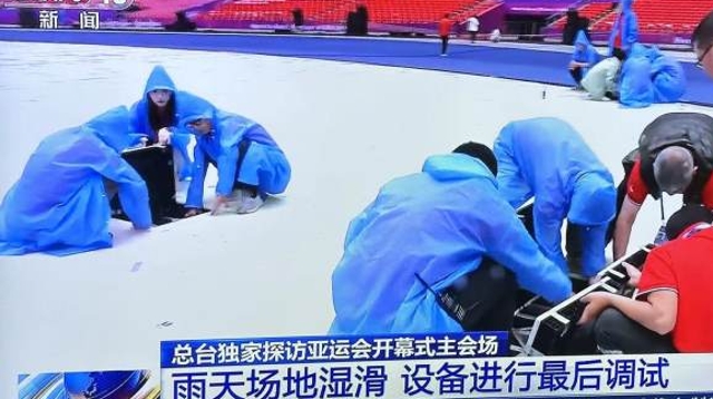 目前,杭州第19届亚运会开幕式正在进行最后调试。今天天空下起了雨,场地地面湿滑,所有设备都在进行最后调试。