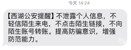 都市快报讯 今天上午,杭州有多位网友称,收到有关电信诈骗的短信提醒。