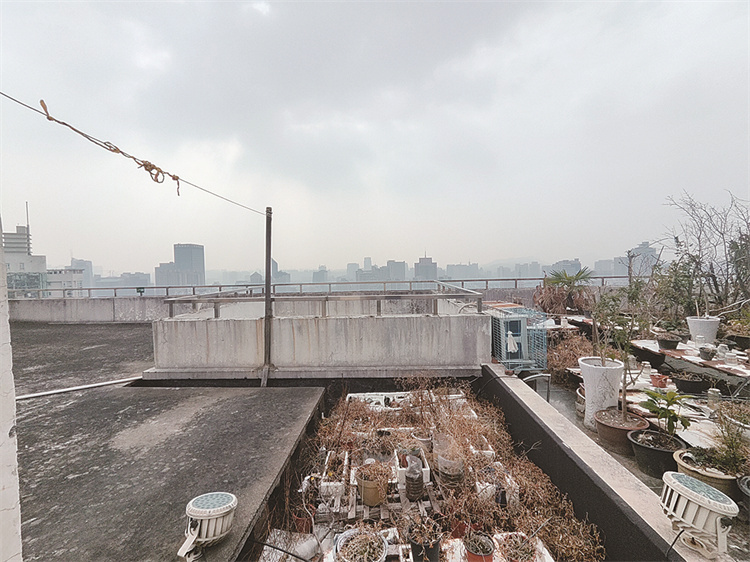 这幢楼共26楼,橙柿直通车记者来到顶楼,只见铺设着地砖和鹅卵石的平台上,摆放着大大小小数十个花盆,由于缺乏打理多数已经发黄枯死。在平台边缘,还砌了花坛,填了土,外接了水管浇灌。