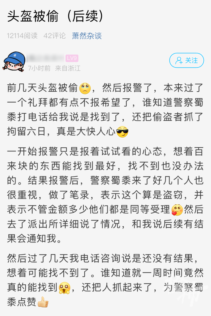 “前几天头盔被偷,本来过了一个礼拜,都有点不抱希望了,谁知道警察蜀黍打电话给我说是找到了,还把偷盗者抓了拘留六日,真是大快人心。