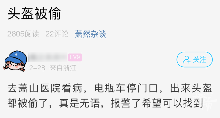 都市快报讯 2月28日,一女孩在萧内网App发帖:“去萧山医院看病,电瓶车停门口,出来头盔被偷了,真是无语。报警了,希望可以找到。”