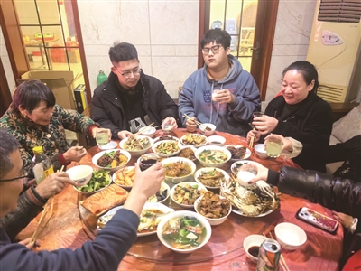 下午5点半,20个菜已经端上了除夕的年夜饭桌,“海陆空”全齐了。小王告诉记者,可惜帝王蟹和东星斑没有上饭桌,被小王爸爸换了大闸蟹和大黄鱼,说是初一有上海客人到来,留给他们。