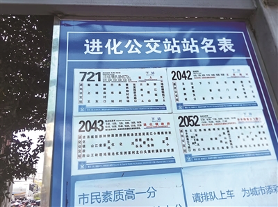橙友“kzJOm61D”向橙柿直通车反映:我是都市快报的忠实读者,看到你们报道1305M公交站牌换好后焕然一新,很高兴。我向你们反映一下,萧山进化公交站的站牌,一块很大的站牌上面有四块小的车次时刻表,一般人根本看不清,建议把发车时刻表放到下面来……