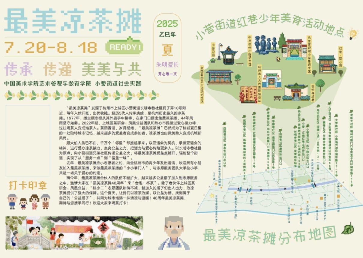 “这次暑期社会实践延续着前面围绕小营街道的社区美育实践,和最美凉茶摊的‘公益搭子’活动进行联动。”中国美术学院艺术管理与教育学院教师赵冰林说。7月初开始,小队里的8名同学就“分头行动”,从地图设计、插图绘制、资料收集到印章制作……让其参与此次公益活动的每位“搭子”用各自最擅长的方式融入其中,传递一份美好、一份清凉。“就像这张地图上所写的:传承、传递、美美与共。”