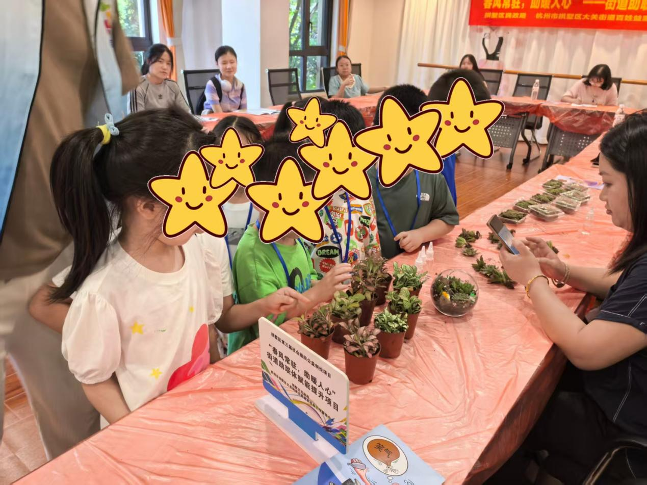 为关爱困境儿童家庭,增进亲子情感交流,7月23日,在拱墅区民政局指导的“春风常驻,助暖人心——街道助联体赋能提升项目”支持下,拱宸桥街道助联体联合大关街道百姓益家社会工作服务中心,精心策划了一场别开生面的亲子微景观DIY手工活动。活动以“夏日拾趣,微观造景”为主题,通过创意手工为困境儿童家庭搭建了一个温馨的互动平台,让爱与陪伴在指尖流淌。