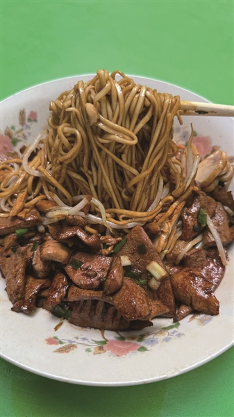 老瓷碗里的拌川油亮诱人,面条弹牙劲道,咸鲜中带着焦香。猪肝外部微微焦黄,里面还是很嫩,绿豆芽的清爽又中和了油脂的厚重。老食客陈先生此时也正在埋头吃面,汤汁沾在嘴角也不在意:“吃了十几年有了,这锅气别处寻不到的。”