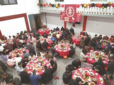 上周末,杭州市富阳区大源镇稠溪村驻军坞自然村的戏台上很热闹,近一半村民聚在这里吃酒贺喜。“村里天天都热闹,但这次最年长的老人过百岁大寿,世上难逢百岁人,就是要红红火火。”