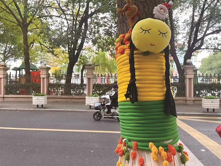 王老师说,“裹树添衣”活动完成后,校内外令人眼睛一亮,很多人来这儿打卡拍照。