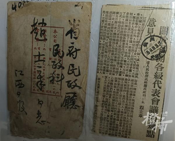 赵大伯说,1950年调往江西省,先后担任南下干部科科长,江西省民政厅干部科副科长、民政科兼土地科科长、厅党组成员、民政干部训练班主任及江西省人民代表会议代表。“我父亲担任江西省民政厅民政科科长期间在江西日报发表了《关于召开各级代表会议的几点意见》,共提出八点意见。”说着赵大伯戴上手套,小心翼翼地从封袋内取出一张剪报,旁边是一信封,上面写有江西日报字样。“这是文章发表后,江西日报派人送到江西省民政厅民政科的。”