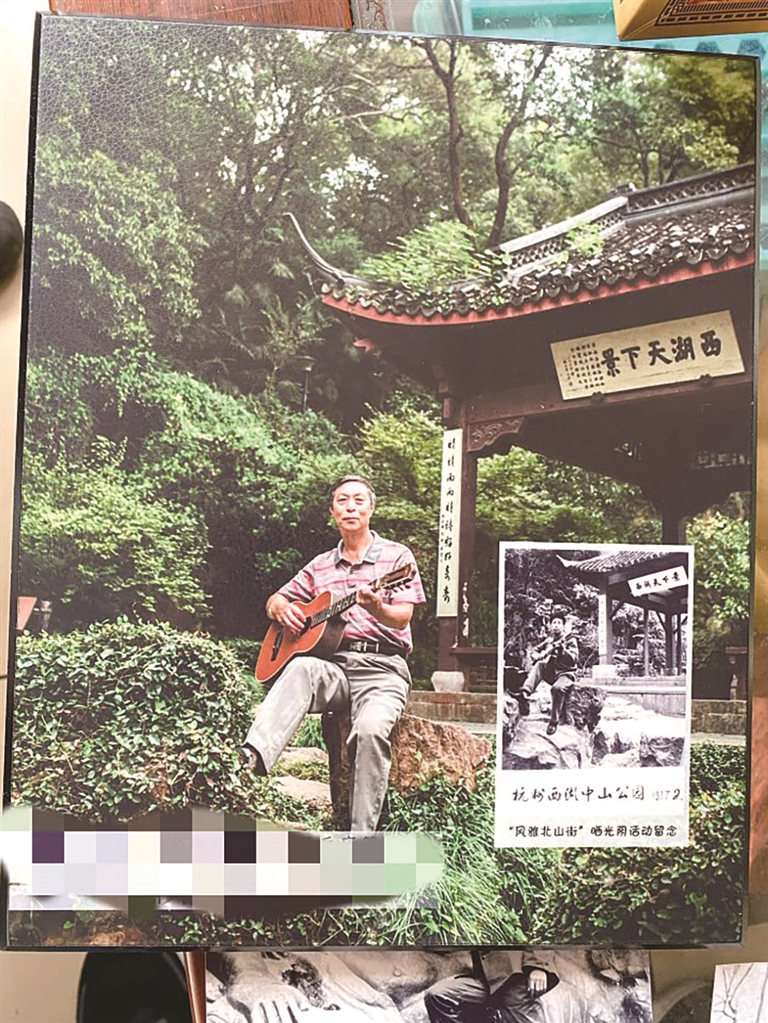 蒋大伯说,他在“西湖天下景”亭子前拍过两张照片。一张拍摄于1977年2月,当时他30岁,在黑龙江生产建设兵团当知青,特意请探亲假回杭游遍各大景点,在“西湖天下景”亭前留影,坐在石头上,抱着当年30块钱买的吉他。另一张拍摄于10多年前,坐在同一块石头上,抱着同一把吉他。