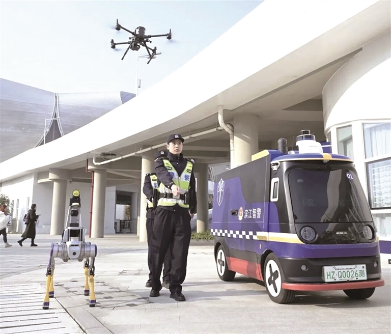 滨江公安智警天团:无人机、机器狗、无人车。