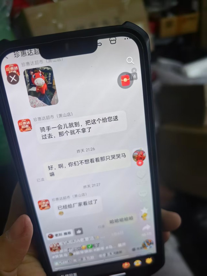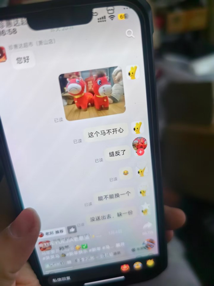 超市员工小刘告诉记者,1月1日总公司调来一批新年礼品——“幸福马”,笑脸的马年吉祥物,大概有几百个,售价25元一个。1月3日,一位顾客订了20只“幸福马”,第二天顾客在平台上留言说:“这个马不开心,缝反了,能不能换一个,没送出去,缺一份。”