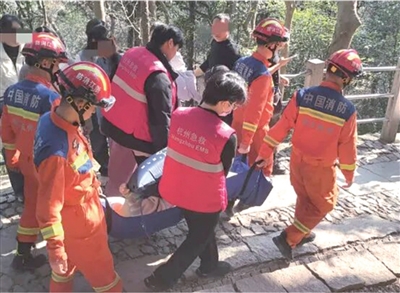 三天前,灵隐消防接到报警,三个女孩上山,其中一个滑倒骨折。“三个女孩都是护士,从北高峰下山时一个女孩摔倒,左脚脚踝骨折。”救援人员说,今年救援的摔伤情况,有正常走台阶上下山的,也有走茶园或野路摔伤的,还有一起在北高峰财神庙旁边摔倒的。