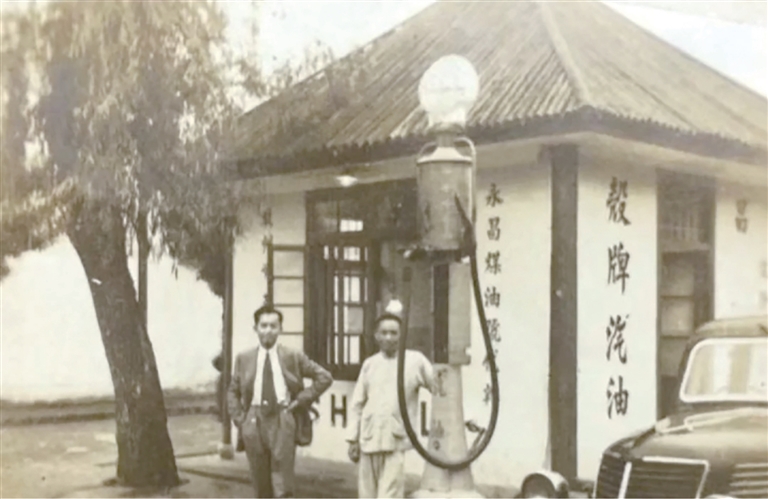 另一张老照片是两名男子在加油站的合影,他们都是加油站员工,加油站外墙有“永昌煤油号”字样。