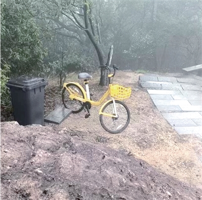 3月1日,下着雨,山上人不多,在去往石人亭还有100米的路上,小栋看到一辆小黄车。