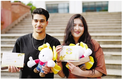 尤博和女友伊萨尔收到“桂宝”玩偶与“桂花”点赞卡。