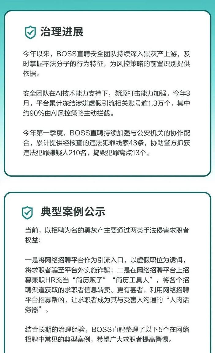 针对黑灰产组织化、隐蔽化的运作趋势,近日,BOSS直聘在日常治理的基础上,进一步加强了源头打击能力,并发布了打击招聘黑灰产的专项治理公告。
