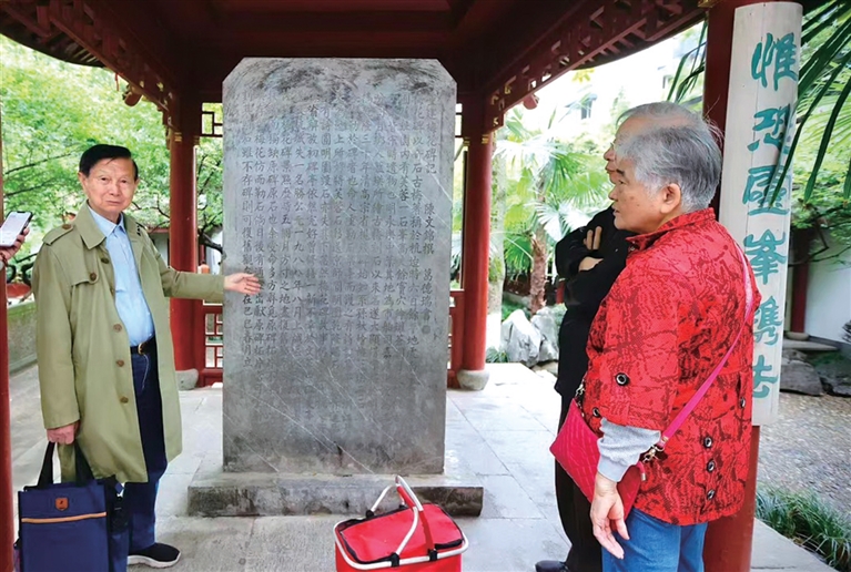 在梅石园的双清亭,丁老抚摸着一块当年刻制的石碑,继续讲述他与梅石碑的往事,吸引不少过往游客和居民聆听。