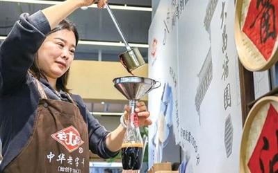二楼是生鲜主场,蔬菜、鲜肉、粮油、禽蛋、服饰,日常所需基本都能在这里找齐。在“老大昌”酱油铺子,市民可以自己舀一瓶酱油带回家。