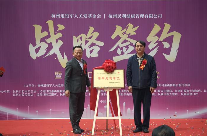 为构建社会化拥军体系,营造关爱退役军人的社会风尚,18日上午,杭州退役军人关爱基金会与杭州民利健康管理有限公司签订战略合作框架协议暨“崇军口腔医疗单位”授牌仪式在民利口腔萧山店举行。民利口腔将依托企业在杭州的16家口腔连锁门诊的优势和先进的医疗服务网络,联合杭州退役军人关爱基金会,开展针对退役军人及优抚对象的口腔医疗健康专属优待服务。中国美术学院书法篆刻系主任,教授,杭州市书法家协会主席张爱国为医牌题字。