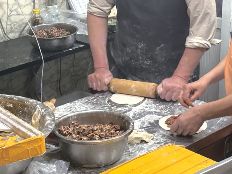 “一天要用10斤土豆、四五十斤肉,土豆丝馅前一天晚上就要准备好,削土豆、切成丝、炒成馅,等凉一些包进饼里,当天根本来不及。肉馅一定是当天早上准备的,新鲜。”