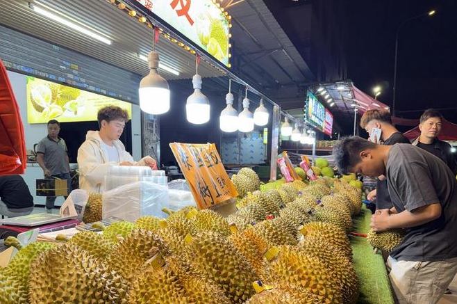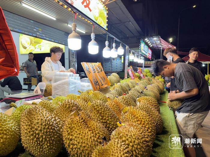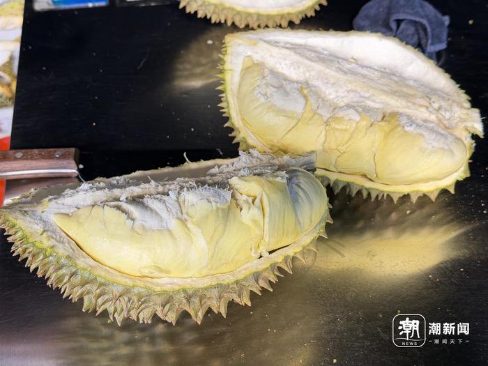 在多姐隔壁摊位,商户浩哥(化名)正在给一位顾客开果。他一边熟练地用刀撬开榴莲壳,一边对记者分析降价的原因,“听供货商说今年泰国那边丰产,货多了自然就便宜。还有就是现在通关快,4天就到了,损耗少,树上熟成本降下来了。”