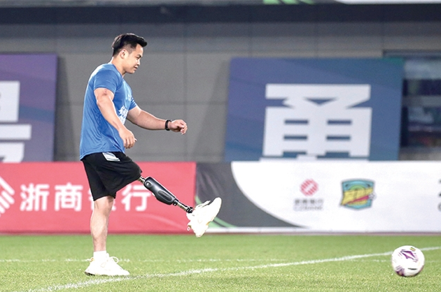 昨晚7点30分,他用自己的智能仿生腿为比赛开球,赢得了全场喝彩。中场休息时,记者采访了林韵。
