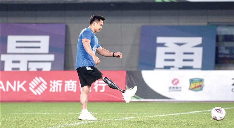 本场比赛还邀请到一位特别的开球嘉宾。林韵,残疾健身健美运动员,也是杭州“六小龙”之一强脑科技的“仿生腿测试专员”。