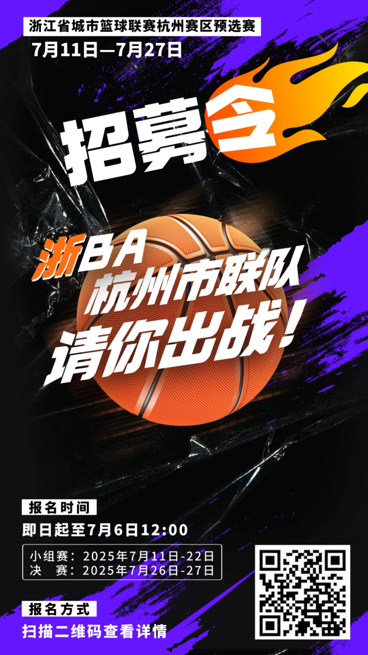 浙江省城市篮球联赛(简称“浙BA”)杭州赛区即将于7月11日拉开战幕,杭州市体育局于今日(7月4日)公开发文招募球员,号召大家踊跃报名,代表杭州出征,捍卫城市荣耀!