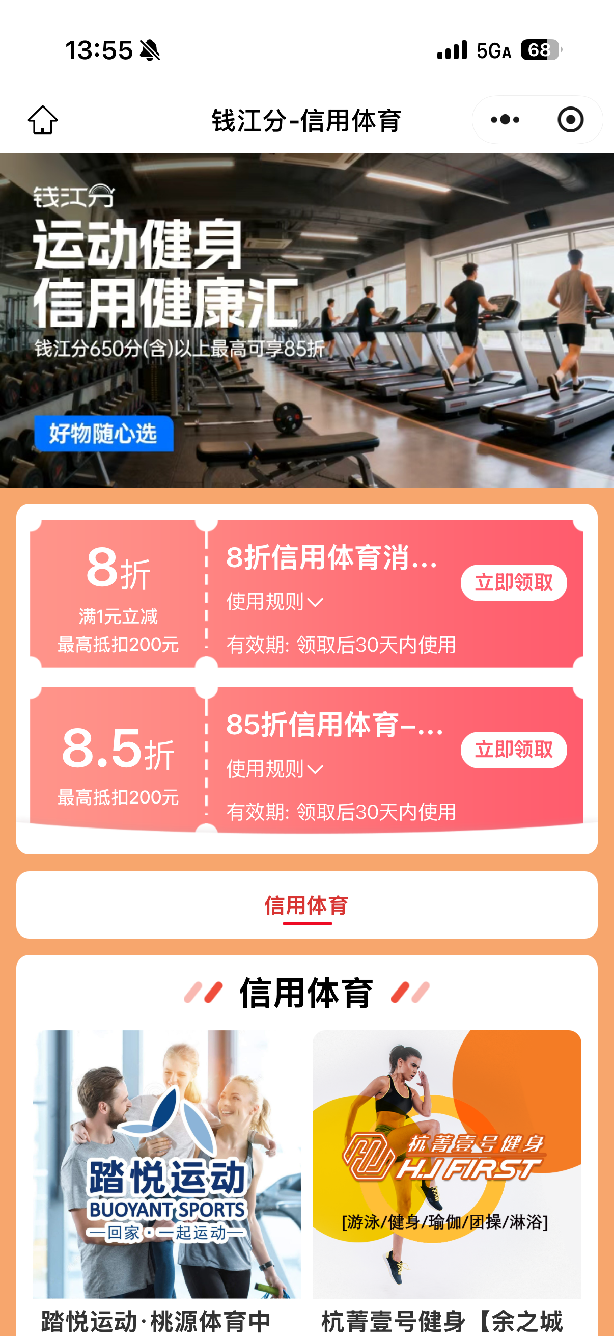 此次上线的体育健身专区,是杭州信用消费体系的第八大应用场景。用户只需完成实名认证,即可查看个人“钱江分”分值,并根据分值等级享受差异化优惠:分值达到750分及以上的用户,可享受8折优惠;650分至750分用户,则可享受8.5折优惠。