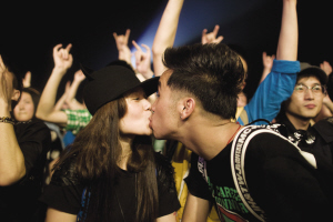 音乐是催化情感的奇迹,台下一对情侣情不自禁地在一片尖叫声中随着音乐接吻。