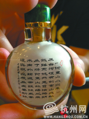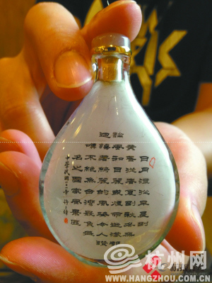 内画中,人物、山水、动物花鸟还好,书法最难。为此许立纬曾经怒得摔了一个练习壶。