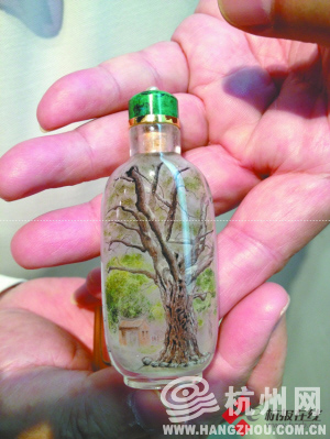 许立纬拿出一根直径七八毫米的铜丝,底端内弯,安上了极细的狼毫。把笔探进纤细的瓶口:“这就可以作画了。”