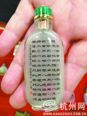 内画壶更是我国独创——乾隆末年,一地方小官进京办事,钱粮耗尽,无奈寄宿在京城一所寺庙里。小官嗜鼻烟成癖,鼻烟用尽,便用烟签去掏玻璃壶壁上粘着的鼻烟,内壁被无意划上了痕。一个和尚看见了,和尚有心,用竹签烤弯削出尖头,蘸上墨,在鼻烟壶的内壁试着画画,这神奇的画就这么诞生了。