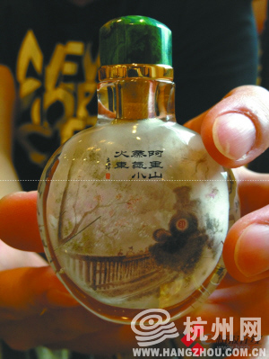 在收藏内画壶时,一定要分清内画壶和印画壶。印画鼻烟壶一般为玻璃吹制而成,在放大镜下看有气泡和杂质。由于画是印制上去的,画面线条呆板,色彩无变化,一些颜色还溢出线条之外,是明显的流水作业制品。