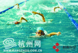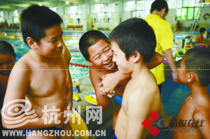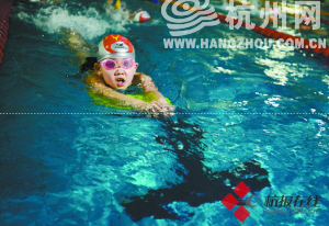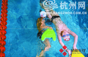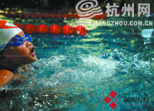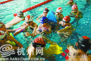 由于游泳程度的不同,孩子们进行着不同的训练。一排小娃娃趴在泳池沿上正接受最初的训练,另有学了一年的孩子们,在下水前5分钟跪在花花绿绿的浮板上进行“压腿”。也有外地人慕名前来。10岁的台湾小姑娘黄龄萱趁着暑期来杭州集训,妈妈在校外租了房子,专门陪她。
