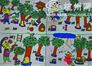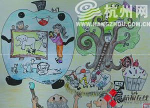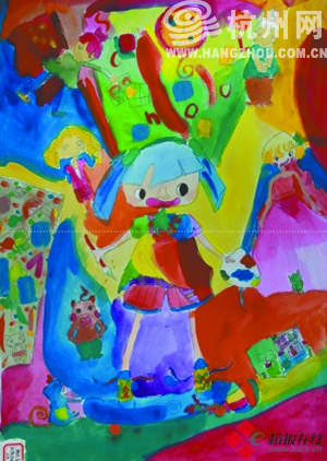 我最喜欢24号王奕歆的作品,这幅画创意新,想象力强,有完整的故事情节,颜色舒服、淡雅,极富线条感。