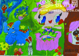我最喜欢的是1号侍若遥小朋友的作品。她的作品中元素丰富,特别是动物形象画得活灵活现,小精灵一样非常可爱。而且这个孩子的想象力很丰富,她要变成动漫王,像树叶一样飞到世界各地结识朋友,分享快乐,分担忧愁,体现出了孩子美好的童心。画面很活跃,很温暖。