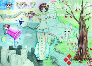 我比较欣赏10号解思勤的作品。14岁其实是一个喜欢画日系动漫的年龄,但是她的作品却没有被现在的市场束缚,充分体现了她的创造力。作品里有许多细节,画布、钟、妈妈,粗中有细。