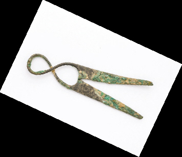 描述:长14.7厘米,剪尖最宽4.5厘米。交股屈环剪,交股饰绳纹,剪柄珍珠底各饰一只西洋狮,纹饰精美,工艺精湛,虽残却是难得的珍品。