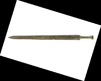 描述:长76.5厘米,宽4.8厘米,素首,扁茎,素格,近锋处收狭,双刃呈弧形,剑身中部有缺口,剑格素装无纹饰,剑身布满不规则斑纹,双刃锋利。