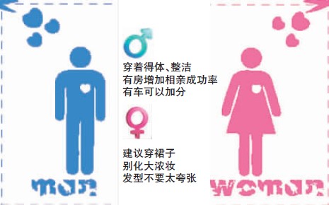 打扮方面,男方最不接受女方化大浓妆,吊诡的发型也很容易成为“秒杀”理由。女方对男方的穿着方面要求不高,“得体”即可。实际上,女方到了相亲这种场合,一个个都是侦探附体,从你头发有没洗看出你的勤快程度,从你衣服的面料牌子看出你的经济能力,从你的整体搭配看出你的审美倾向。有位女孩子要求对方年收入50万元以上,相亲这天一看男方穿了件旧T恤,女孩妈妈拉着女儿的手就走,其实男方的收入还真不错,只是不修边幅而已。总之,出门相亲穿体面点是没错的。
