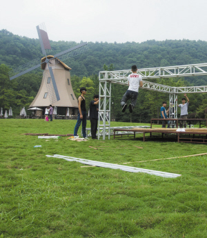 搭建音乐节主舞台的工作人员已经玩起来了