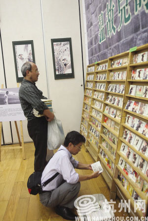晓风书屋的书市主题是“只淘好书”。老板娘朱钰芳拿出了整整五大书架的珍藏旧书及一面墙的小人书、连环画。别看是书页发黄的旧书,每一本背后却都有一段温暖鲜活的故事。“这批书是我们店里的宝贝,都是熟客间往来,一般很少公开场合拿出来卖。”朱钰芳说,“看着它们,就想起很多老朋友。它们都是书店老顾客收藏了很多年后去世,他们的儿女托付给我们寄卖。也不是子女不想要了,只是藏书需要机缘和耐心,他们交给我们,觉得放心,希望能找到更适合这些书的主人。”说着,朱钰芳随手抽出书架上的一套《罪惟录》,“这次卖的旧书基本是一版一印,非常难得。就拿这套来说,1986年5月浙江古籍社出的,原价25元,现在一千元都不止。”